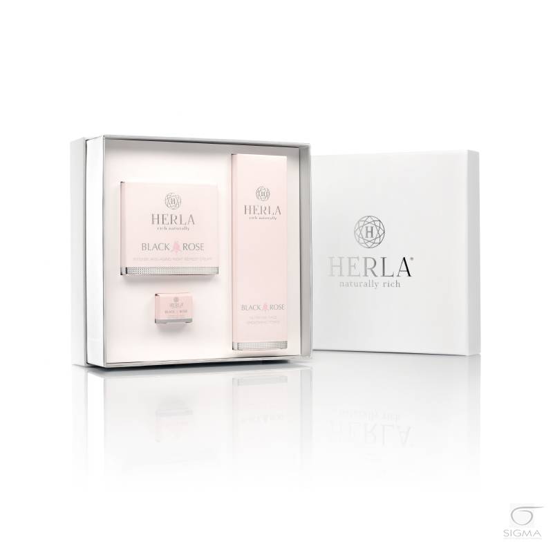 domowej marki Herla. Opakowanie zawiera produkty z serii odmładzającej "Black