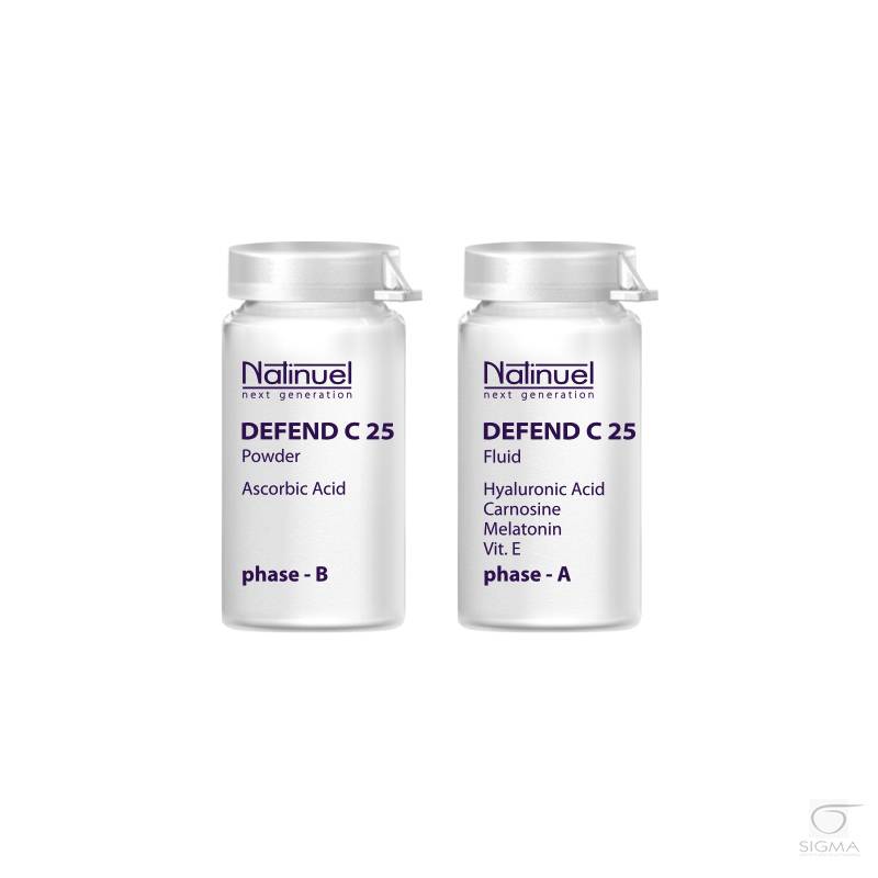 Właściwości Defend C25: Produkt złożony z bio-komponentów, który należy przygotować około 30 min przed aplikacją na skórę, aby w ten sposób zapewnić optymalny poziom witaminy C. Wyjątkowość preparatu stanowi wysokie stężenie witaminy C - ponad 25%, która została wzbogacona o witaminę E, melatoninę, karnozynę i kwas hialuronowy. Ze względu na swoje unikalne właściwości Defend C 25 ma istotne znaczenie w przypadku skóry wymagającej kompletnego i strukturalnego działania odmładzającego. Polecany jest również do skóry ze stanem zapalnym, podrażnieniami, przebarwieniami oraz do skóry osłabionej.