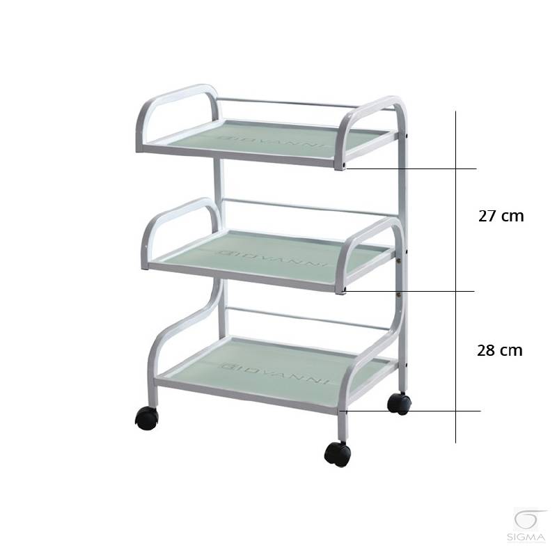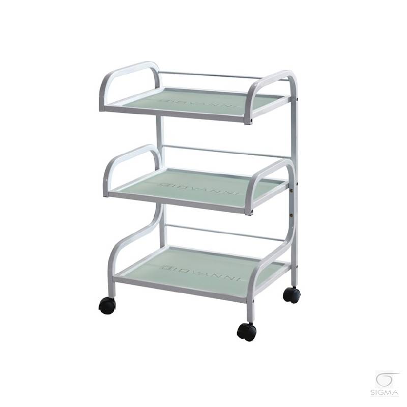 Opis produktu:Estetyczny stolik pod urządzenia kosmetyczne, metalowo-szklany, z gumowanymi kółkami. Posiada trzy szklane półki z grawerowanym logo Giovanni.
