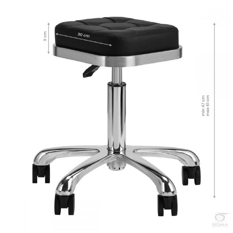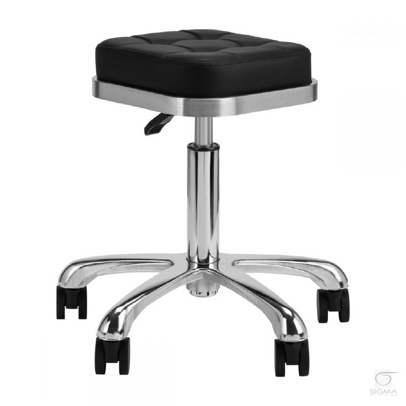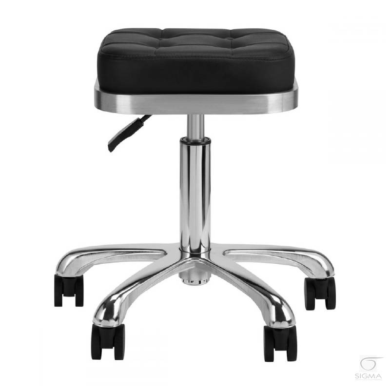 Opis produktu:Wyjątkowy taboret kosmetyczny w kolorze czarnym, pikowanym siedziskiem i metalowym wykończeniem w kolorze srebrnym. Posiada regulację wysokości i pęcioramienną podstawę wyposażoną w solidne kółka.